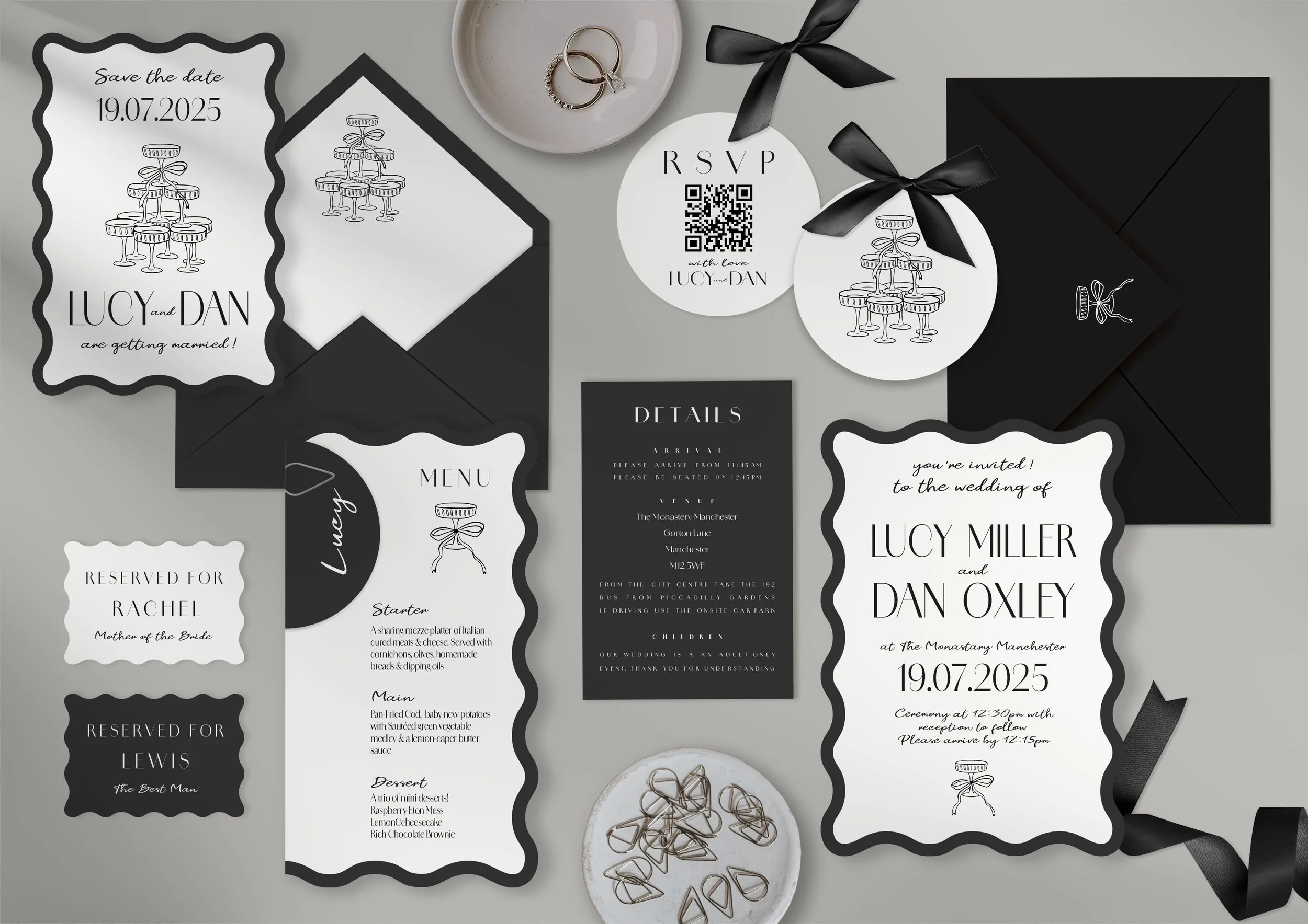 It includes a fully bespoke design for your save the dates, invitations and envelope liner.